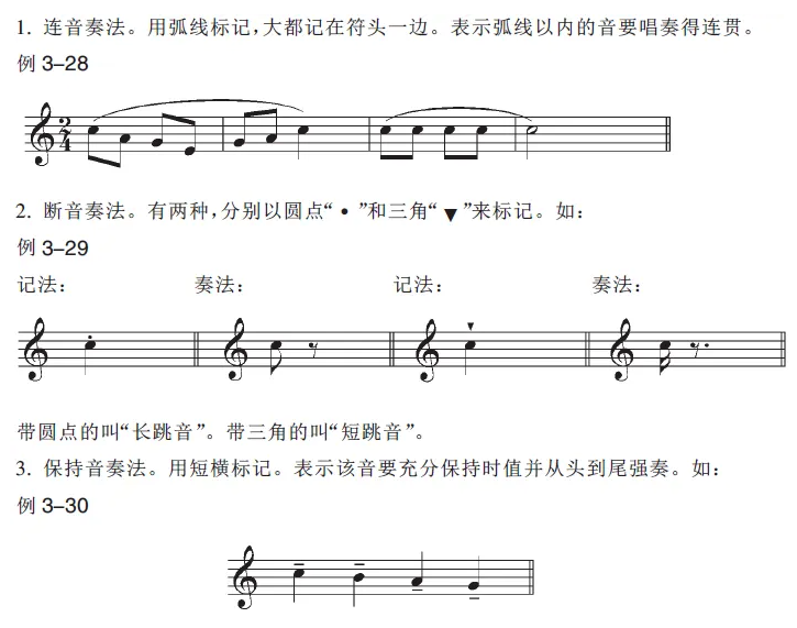 為了避免代表斷音的圓點(diǎn)和高音點(diǎn)相混,在簡譜中斷音用▽或▼來表示。短倚音用小的十六分音符或十八音符標(biāo)記,寫在主要音的左上方或右上方,并用連線與被裝飾的主要音相連。